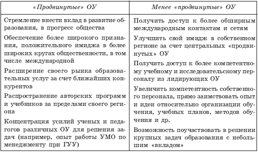 Сотрудничество – это кооперация организаций для совместного решения общих проблем и взаимного наращивания потенциала. В сфере образования сотрудничество (стратегическое и долговременное партнерство) приобретает иногда первостепенное значение, обусловленное прежде всего следующими причинами: общностью проблем, стоящих перед образовательными учреждениями; возможностью взаимного наращивания потенциала друг друга; привлечением одного контингента обучающихся; ограниченностью ресурсов на маркетинг. Простой и традиционный для России обмен опытом между коллегами явно недостаточен для сферы образования. Различия между образовательными учреждениями как по целям, так и по кадровому потенциалу, по социально–экономической и культурной среде, чрезвычайно важной не только для организации, но и для содержания образования, не позволяют говорить о простой повторяемости опыта успешно действующих образовательных учреждений. Им нужно именно сотрудничество, позволяющее решить ряд проблем в отношении студентов, учебного процесса, сотрудников и самих образовательных учреждений. Мотивы интеграции образовательных учреждений (ОУ) представлены в табл. 6.5.