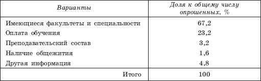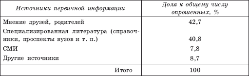2. Из каких источников потребители получают информацию об образовательных учреждениях и их услугах? Какие из этих источников пользуются наибольшим доверием потребителей? Знание наиболее популярных и достоверных, по мнению потребителей, источников информации об образовательном учреждении и его образовательных услугах позволит образовательному учреждению налаживать эффективные коммуникации и выгодно вкладывать средства в продвижение своих образовательных услуг. Основные источники первичной информации о вузе представлены в табл. 7.3.