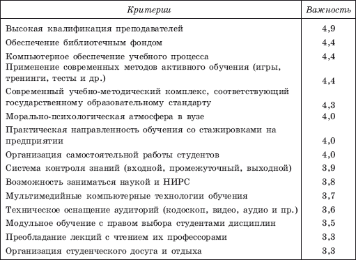 Первоначальная оценка вариантов получения образования, выбор наилучшего варианта. Первоначальная оценка вариантов получения образования – третья стадия процесса принятия решения, определяется как процесс оценки альтернатив получения образования с точки зрения ожидаемой выгоды и ограничения выбора до предпочтительного варианта. Оценка вариантов получения образования проводится по различным критериям – конкретным показателям, которые рассматриваются при выборе альтернатив. Главными критериями оценки вариантов являются стоимость обучения и название вуза как показатель качества обучения. Экспертная оценка важности критериев качественной подготовки специалистов в вузе представлена в табл. 7.5 (оценка проведена по пятибалльной шкале, где 1 – совершенно неважно, 2 – неважно, 3 – существенно, 4 – важно, 5 – очень важно).