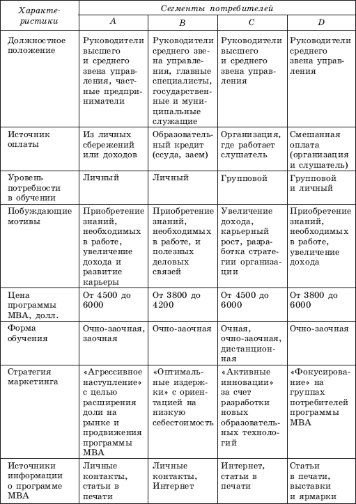 Учреждение дополнительного профессионального образования по программе МВА может предпочесть обслуживание всех потребителей на рынке дополнительного профессионального образования по программе МВА либо сконцентрироваться на одном или нескольких сегментах. Существует необходимость определения