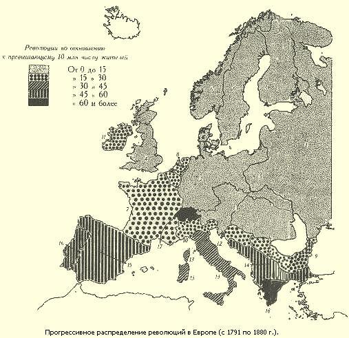 Другое доказательство влияния климата на политические и другие революционные движения имеется в географическом распределении восстаний в Европе между 1791 и 1880 годами, как это представлено на прилагаемой таблице. Из таблицы ясно, что число восстаний увеличивается с севера на юг вместе с температурой; действительно, Греция дает максимум восстаний — 95 на 10 миллионов жителей; Россия — минимум — 0, 8. Наименьшее число восстаний падает на северные страны: Англия, Шотландия, Германия, Польша, Швеция, Норвегия, Дания; самые большие цифры дают южные: Португалия, Испания, Европейская Турция, Южная и Центральная Италия; среднее число встречается приблизительно в центральных государствах.
