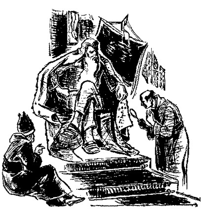 Ювелир вздрагивает от его голоса и принимается суетливо шарить в тайных карманах своего синего облачения. Он извлекает из них лупу, резец, щипчики и еще кое-какие мелкие инструменты и флакончики с кислотой. Робко косясь на бога, он всходит на ступеньки престола и, припав к божеской мантии, принимается тщательно изучать необыкновенные бриллианты.