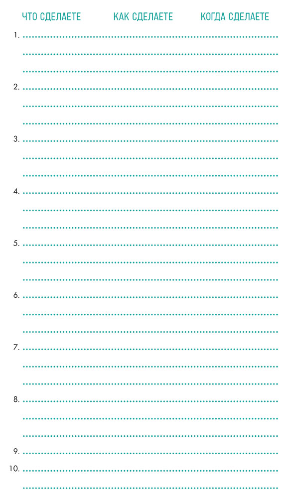Конечно, просто записав мечту и не приложив никаких усилий, ничего не добиться. Обязательно укажите десять шагов, которые предпримите, чтобы первая цель была достигнута, обращая особое внимание на следующее: как, что и когда планируете делать.