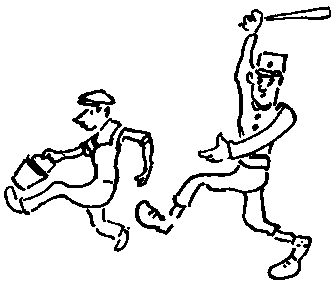 Несколько дней занял у нас трюк с кистью. По ходу пантомимы трусливый полицейский садится на кисть, забытую мальчиком на скамейке. Кисть в клее, она прилипает к штанам полицейского. Тот с силой отрывает ее от штанов вместе с куском материи. Никак мы не могли решить эту задачу. Испробовали буквально сотни вариантов (вплоть до магнита!). В конце концов придумали сложное приспособление с острыми гвоздями, торчащими у меня сзади. Я садился на кисть, в которую входили гвозди. Я вставал, и кисть висела у меня на штанах. (Потом, уже во время нашего выступления с клоунадой, кто-нибудь за кулисами, подходя ко мне близко, натыкался на гвозди и, конечно, с криком отскакивал.)