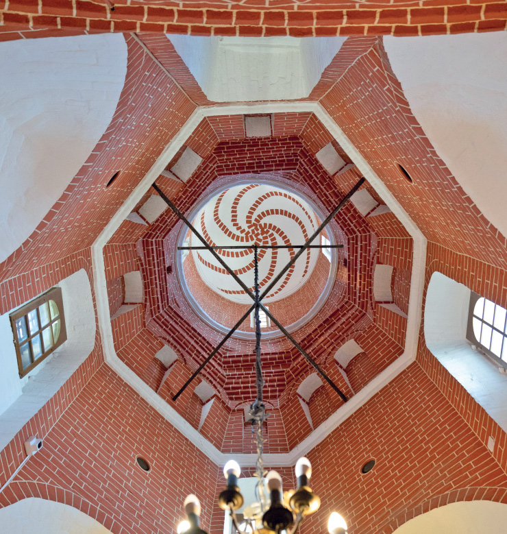 Кирпич как строительный материал был самым популярным и модным материалом XVI века, именно поэтому стены тогда как снаружи, так и внутри красили, имитируя идеальную кирпичную кладку. В соборной церкви Александра Свирского полностью открыты и восстановлены росписи под кирпич XVI века. Сегодня нам удивительно и непривычно, что когда-то весь собор выглядел именно так – строго и аскетично.