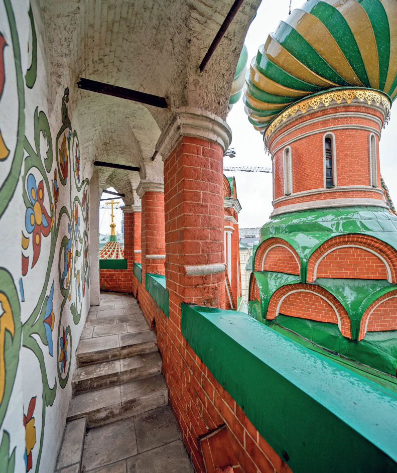 Я приглашаю вас в собор Покрова Пресвятой Богородицы на Рву на Красную площадь (он же собор Василия Блаженного). Рассматривая росписи, вы будете уверены в их подлинности – именно они украшали стены собора на протяжении пяти веков. Да, их периодически реставрировали, закрывали более поздними росписями, но, к счастью, многое сохранилось. Только представьте, что собор – единственный в мире, чьи фасады и интерьеры на 90 % покрыты росписям. И он таким был всегда: в XVI веке весь расписан «под кирпич», в XVII веке на стенах «распустились» пышные цветочные узоры, а в XVIII и XIX веках появился новый орнамент. В начале XX века церковь Василия Блаженного и примыкающие к ней помещения первого этажа собора расписали заново.