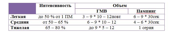 В таблице указаны данные в расчете на 1 группу мышц, для средней и тяжелой пампинг нагрузки количество подходов в серии равно 2 – м, для легкой нагрузки – 3.