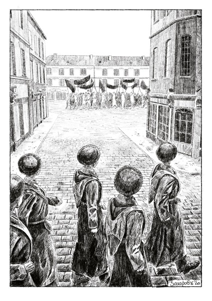 Из подъезда напротив вдруг вылетел мальчишка, наверное, ровесник Федора, Пети и Кости. Были на нём короткие синие штаны выше колен да видавшая виды рубаха в клетку с закатанными рукавами. Светлые волосы растрёпаны, а под глазом свежий синяк.