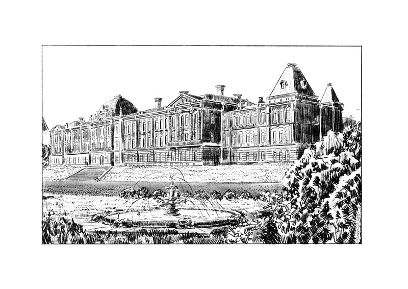 От ворот начиналась широкая и прямая аллея, обсаженная вековыми липами. Впереди, в её конце, виднелось трёхэтажное широкое здание, классического лимонного цвета с белыми колоннами и фронтонами, высокими арчатыми окнами первого этажа.