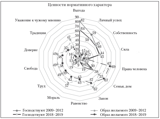 Исследования 2009–2019 гг. показали, что последнее десятилетие (фактически последнюю четверть века) в России в публичном дискурсе в качестве нормативно-ценностных оснований российского социума и государства преобладают, если не господствуют, выгода, сила и собственность и т. п., оттесняя закон и права человека, свободу и равенство, доверие, традицию и мораль (см. рис. 1).