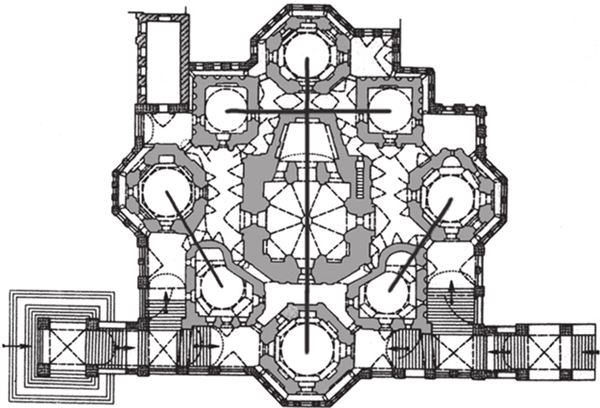 Несомненно, на должности придворных строителей и зодчих в Москве с охотой зачисляли иностранцев. Однако трудно представить, чтобы Ивана Грозного и митрополита Макария в качестве плана замышлявшейся общеправославной святыни мог увлечь лишь бумажный чертеж (если предположить, что таковой был им показан). [32] В средневековой Руси храмосозидание являлось не только искусством, но и священнодействием, подобным иконописанию. Царь и митрополит хорошо знали, чего хотели, и не доверили бы возведение сооружения исключительной значимости безвестному иноземцу, не испытав его способностей.