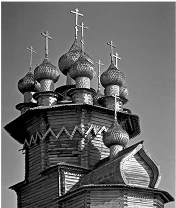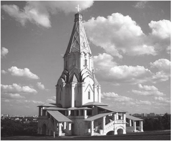 В облике церкви Вознесения в Коломенском собраны наиболее типичные черты русского деревянного зодчества: высокий шатер, круговое гульбище на столбах, мотив пламевидных завершений – наличников окон четверика и кокошников, тройным поясом соединяющих его с восьмериком, а затем повторенных в основании и на вершине шатра. [38]