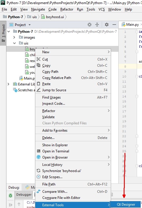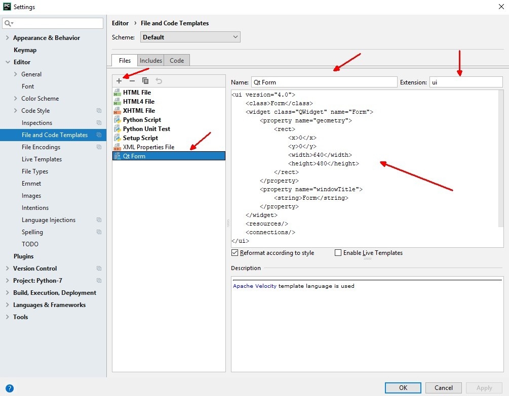 1.5.1 Настройка в PyCharm мастера для создания QtForm