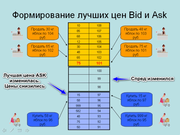 Т.е. активность рыночного покупателя, желающего срочно купить товар, купить, как на Форексе говорят с рынка, спровоцировала рост цен и изменение спреда.