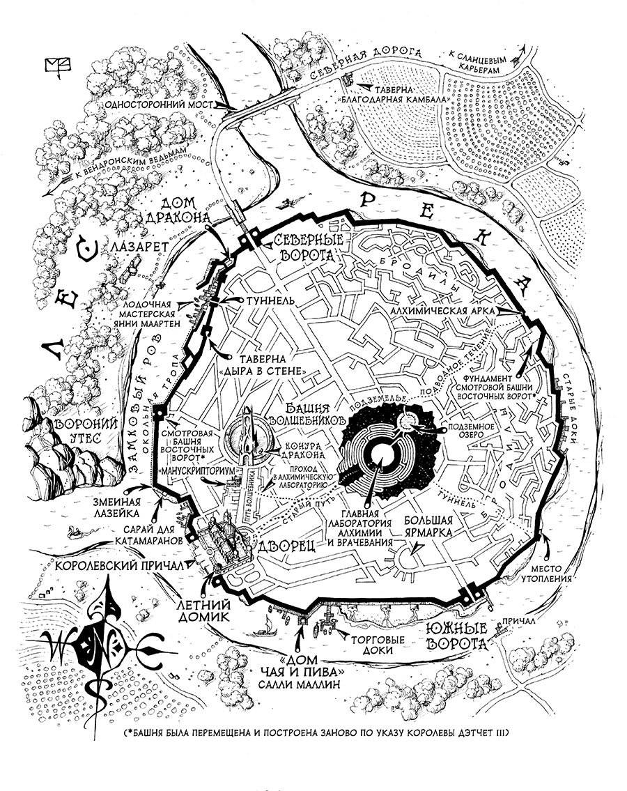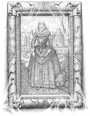 Сайлас тоже смотрит на портрет. Очень искусная работа. Художник изобразил какую-то королеву, правившую Замком в стародавние времена. А что времена стародавние – сразу ясно, потому что на королеве еще Истинная корона, которая уж много веков как утеряна. У королевы заостренный нос и волосы закручены вокруг ушей в причудливой прическе. К юбке жмется Эй-Эй, страшный зверек с мордой крысы, когтями хищника и змеиным хвостом. Его круглые красные глазки вперились в Сайласа, как будто Эй-Эй хочет укусить его своим длинным и острым, как игла, зубом. Королева тоже смотрит на волшебника, и на лице ее высокомерное неодобрение. Она горделиво подняла голову, вскинув подбородок над гофрированным накрахмаленным воротником, и ее колючие глаза поблескивают в свете свечи и словно следят за каждым движением Сайласа.
