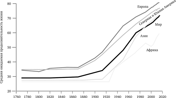 Приведенный на рис. 5–1 график, составленный Максом Роузером, показывает изменение ожидаемой продолжительности жизни на протяжении веков и выявляет общую тенденцию в мировой истории. В самой левой части рисунка, то есть в середине XVIII века, ожидаемая продолжительность жизни в Европе и обеих Америках составляла около 35 лет, и этот показатель почти не менялся все те предшествующие 225 лет, для которых у нас имеются данные [130] . В целом по миру ожидаемая продолжительность жизни была тогда 29 лет. Похожие значения характерны для практически всей истории человечества. Охотники-собиратели жили в среднем по 32,5 года, а среди народов, первыми занявшихся сельским хозяйством, этот срок, вероятно, уменьшился из-за богатой крахмалом диеты и болезней, которые люди подхватывали от своего скота и друг от друга. В бронзовом веке ожидаемая продолжительность жизни вернулась к тридцати с небольшим и оставалась такой на протяжении тысячелетий с небольшими колебаниями в отдельные столетия и в отдельных регионах [131] . Этот период человеческой истории, который можно назвать Мальтузианской эрой, – время, когда эффект от любого прогресса в сельском хозяйстве и медицине быстро сводился на нет последующим резким ростом населения, хотя слово «эра» едва ли уместно для 99,9 % срока существования нашего вида.