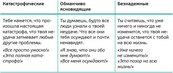 Эти и другие похожие мысли могут быть сильно преувеличенными, а иногда и вовсе ошибочными. Хотя нам и кажется, что они правдивы. Тогда они заставляют нас чувствовать себя неуверенно, парализуют наши действия или заранее программируют на неуспех.