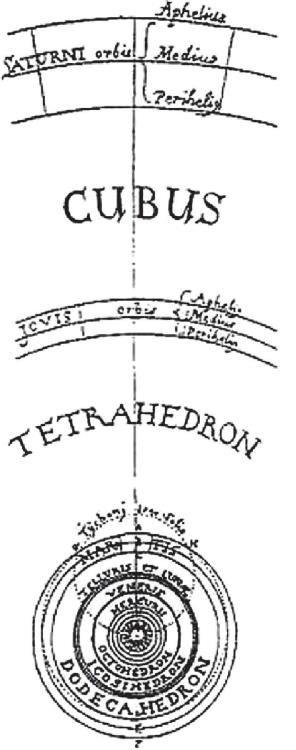 План планетных орбит, построенных с помощью вписанных и описанных многогранников, показанный в книге И. Кеплера «Гармония мира». Расстояния до планетных орбит автор определяет в соответствии с построением золотого сечения, используя длину энергетической стоячей волны