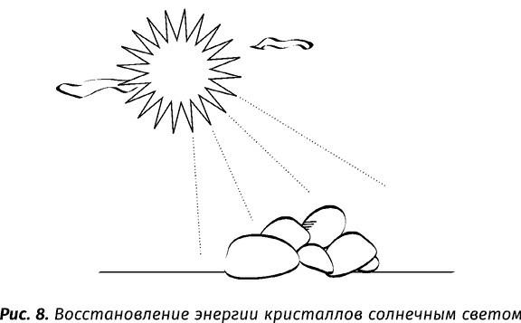 Кристаллы можно положить на кварц или сердолик, однако самый мощный источник энергии для всех камней – это солнце (см. рис. 8), особенно его любят красные и желтые камни. Оставляя их на солнце, помните о противопожарной безопасности. Также не забывайте и о том, что мягкие и хрупкие кристаллы могут выгореть.
