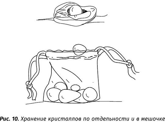 Правильное хранение кристаллов гарантированно защитит их от заражения негативной энергией из окружающей среды или плохих вибраций других людей. Необработанные камни лучше всего хранить в отдельной коробке или мешке, обернув каждый мягкой тканью (см. рис. 10). Обработанные допустимо держать в общем мешочке. Если же вы добавите к ним сердолик, ваши камни всегда будут очищены, заряжены энергией и готовы к работе.
