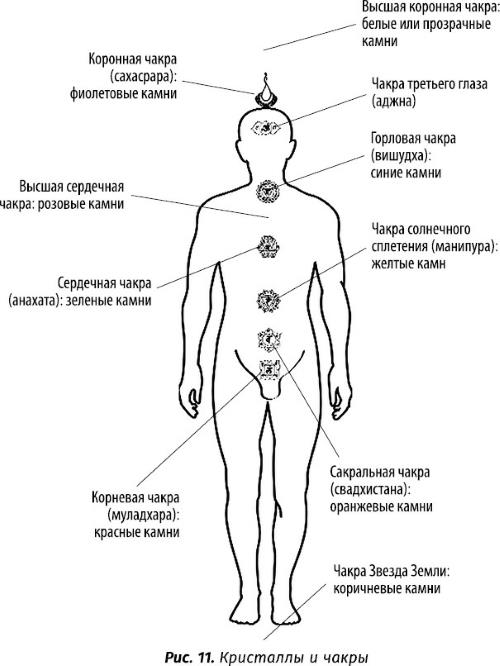 Традиционно каждой чакре соответствуют определенные вибрации и цвет (см. рис. 11). Это нужно учитывать, располагая кристаллы для устранения дисбаланса. Когда чакры в гармонии с кристаллами, улучшение общего состояние, исцеление от недугов и умиротворение не заставляют себя долго ждать.