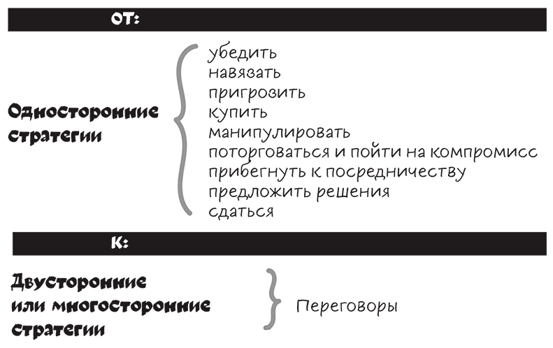 Если вам отвечают «нет», если ваша попытка договориться ни к чему не привела, тогда можете обратиться к любой из перечисленных стратегий (рис. 1.2), не забывая, что каждая из них имеет свои последствия. То, как вы рассматриваете другого человека и обращаетесь с ним, сильно влияет на то, что вы получаете в ответ [5] . В ваших же интересах видеть в нем партнера и хорошую возможность, а не проблему или досадную помеху.