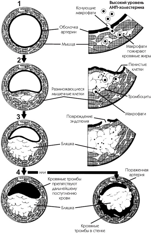 Развитие атеросклероза: 1 – нормальная коронарная артерия; 2 – начальная стадия атеросклероза (симптомов может не быть); 3 – закрытие коронарного сосуда на 75 % (стенокардия); 4 – тромбоз сосуда (кровоток полностью прекращен; инфаркт)