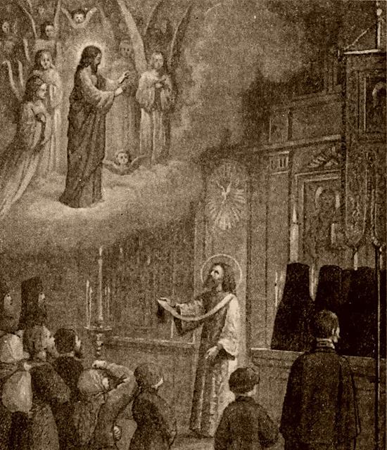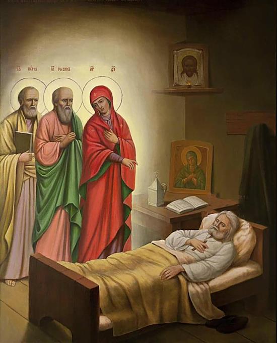И как пеклися! В 1780 году послушник Прохор тяжко разболелся. Он слег на жесткое ложе: тело его распухло; больной лежал неподвижно. Неизвестно какая была у него болезнь; врача при нем не было: некому было определить вида болезни. По внешнему признаку думали, что Прохор страдал водяной болезнью. Но никакому сомнению не подлежит то, что был недуг упорный и продолжительный, длившийся в течение трех лет, половину коих страдалец провел в постели. Больной всецело предал свое тело и душу Богу, молился, омывал слезами ложе свое; слово ропота никогда не сходило с уст его. Тут-то открылось как все и прежде других начальствующие в монастыре, уважали, любили и жалели Прохора. Во время болезни Прохору служил, как послушник, старец о. Иосиф, его наставник и руководитель в приготовительных иноческих трудах. Строитель Пахомий, старец о. Исаия, также много пеклись о нем. Спустя много лет после сего (25 мая 1832 г.) в беседе с одной особой о. Серафим с чувством глубокой благодарности вспоминал об этой заботливости старца Пахомия. «У меня, – говорил он, – в тот раз был друг здесь в обители иеромонах Пахомий. Когда я был болен, полтора года лежал в постели, он ходил за мной, почти неотлучно находился при мне». После мы увидим как о. Серафим на деле выразил благодарные чувства к старцу Пахомию. В настоящий же раз не забудем, что Пахомий был настоятелем обители, а Прохор – послушник… и к нему-то ради недугов относились с таким усердием и заботой и строитель, и следующие после него старцы. Это обстоятельство обнаруживало в старших братиях обители высокую степень внимательности и попечения о младших, – как и должно быть во всяком благоустроенном, особенно церковном обществе. В последнем развитии недуга стали опасаться за жизнь больного. Тогда о. строитель с решительностью предлагал ему пригласить врача или по крайней мере открыть кровь. Весьма замечателен аскетический ответ больного: «я предал себя, отче святый, истинному врачу душ и телес, Господу нашему Иисусу Христу и Пречистой Его Матери; если же любовь ваша рассудит, снабдите меня убогого, Господа ради, небесным врачевством (те. причастием св. Таин)». Старец Иосиф по просьбе его и собственному усердию особо отслужил о здравии больного всенощное бдение и литургию. К богослужению собрались братия из усердия помолиться о страждущем; Прохор был исповедан и причастился св. Христовых Таин, которые были принесены в его келью, к одру его. Незадолго до кончины свой о. Серафим, всегда говоривший истину и ненавидевший ложь, многим особам рассказывал, что в этот раз по причащении святых Таин ему явилась в несказанном свете Пресвятая Дева Мария с апостолами Иоанном Богословом и Петром, и обратясь к Богослову лицом, перстом же указывая на Прохора, сказала: этот нашего рода [4]
