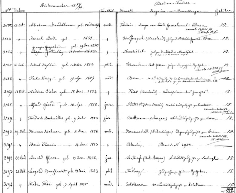С большей уверенностью можно утверждать, чем занималась, находясь в Швейцарии, жена Н. И. Зибера Надежда Олимпиевна Зибер-Шумова – сначала студентка медицинского факультета в университете Берна (с 1875 по 1877 г. – см. рис. 1), а затем научный партнер профессора М. Ненцкого в университете Берна (1877–1891); когда Ненцкий обосновался в Санкт-Петербурге в 1892 г., она последовала за ним в качестве ассистента. Доктору медицинских наук, выпускнице Бернского университета 1880 г. Н. О. Зибер-Шумовой прочили тогда блестящую карьеру ученого-биохимика.