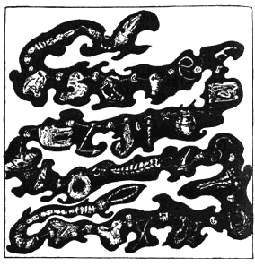 Здесь нарисован Амма, краб, убегающий в море в то время как старый волшебник разговаривает с человеком и его маленькой дочкой. Старый волшебник сидит на своём волшебном троне, окутанном волшебным облаком. Те три цветка, которые ты видишь перед ним, — цветы волшебные. На вершине горы ты можешь разглядеть всем слонам слона, всем коровам корову и всем черепахам черепаху; они идут играть в игру, которой их научил волшебник. На спине коровы — горб, потому что она была всем коровам корова, и у неё должно было быть все, что имелось у коров, явившихся позже. Под холмом животные, наученные играм, в которые они должны были играть. Видишь, всем тиграм тигр улыбается костям всех костей; ты можешь видеть всем лосям лося, всем попугаям попугая и всем кроликам кролика. Остальные животные по ту сторону холма, поэтому я не нарисовал их. Домик на холме — всем домам дом. Старейший волшебник сделал его, чтобы показать человеку, как надобно строить дома, если они ему понадобятся. Змея, окружающая остроконечный холм, всем змеям змея; она разговаривает со всем обезьянам обезьяной; обезьяна была груба со змеёй, и змея собирается нехорошо поступить с обезьяной. Человек очень занят разговором со старейшим волшебником, а его маленькая дочка смотрит, как Пау Амма убегает в море. Горбатая вещь в воде — это и есть Амма. В те времена он не был обыкновенным крабом. Он был краб-король. Потому-то у него совсем особенный вид. Похожие на кирпичи перегородки — большой лабиринт. Когда человек перестанет разговаривать со старейшим волшебником, он войдёт в лабиринт, потому что должен войти в него. Знак на камне под ногой человека — знак магический. Внизу я нарисовал три волшебных цветка; между ними магическое облако. И вся эта картинка — странная волшебная. Это называется чёрная магия.