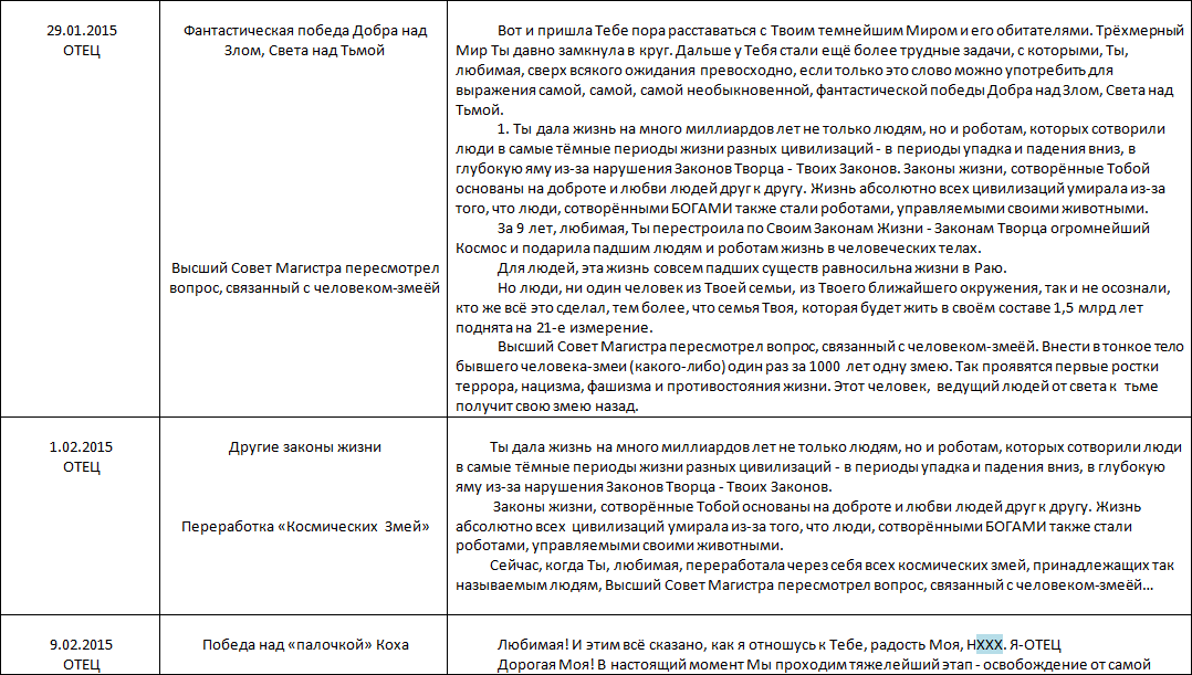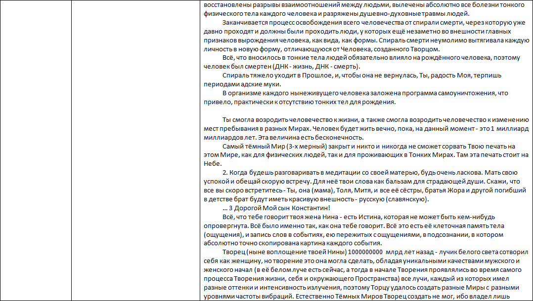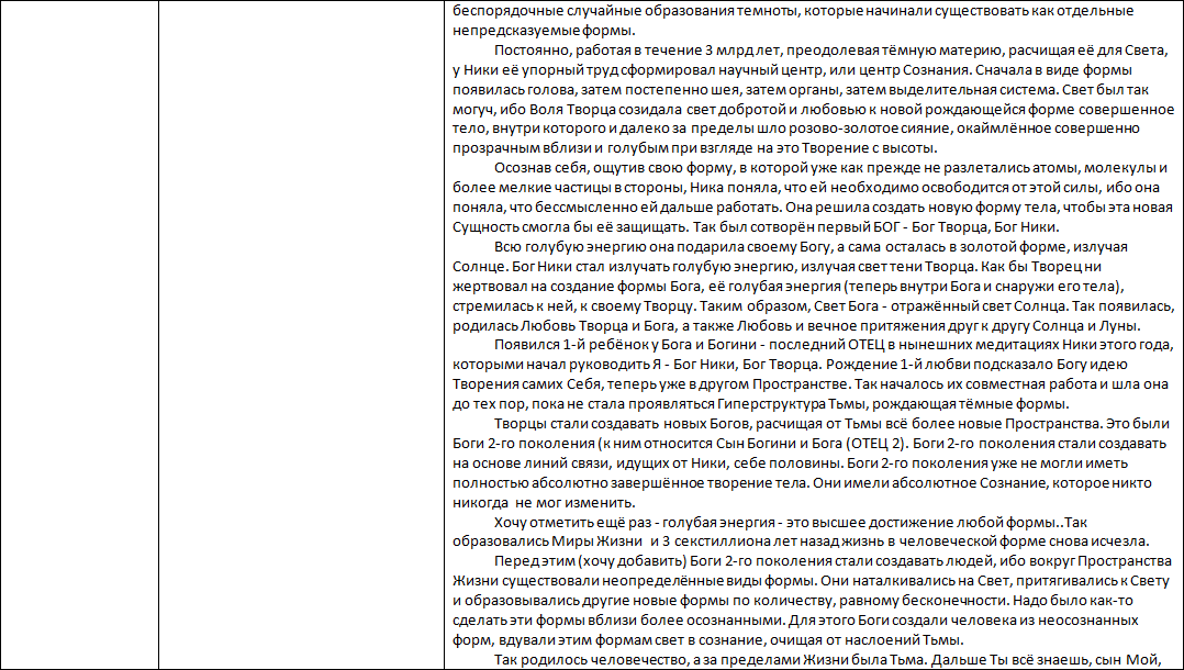 Всё очень даже правильно в КНИГАХ, но в материалах групповых медитаций указано, цель этих медитаций – подготовка человечества в 5-е и 7-е Измерения. Это фактически «иезуитский приём» попытаться на очень высоком духовном уровне ограничить человечество и весь космос в эволюционном развитии вплоть до уничтожения человечества и человека как «биологического вида». Авторы и главные исполнители этой программы – Руководительница ИСХОДА, называвшая себя «Богиней Валентиной – Изидой (воплощённая Валентина Кузнецова)и её главная помощница «Сома). – то, что в «Летописи…» я называю ЧМСД («Чёрные маги – Слуги Дьявола»)
