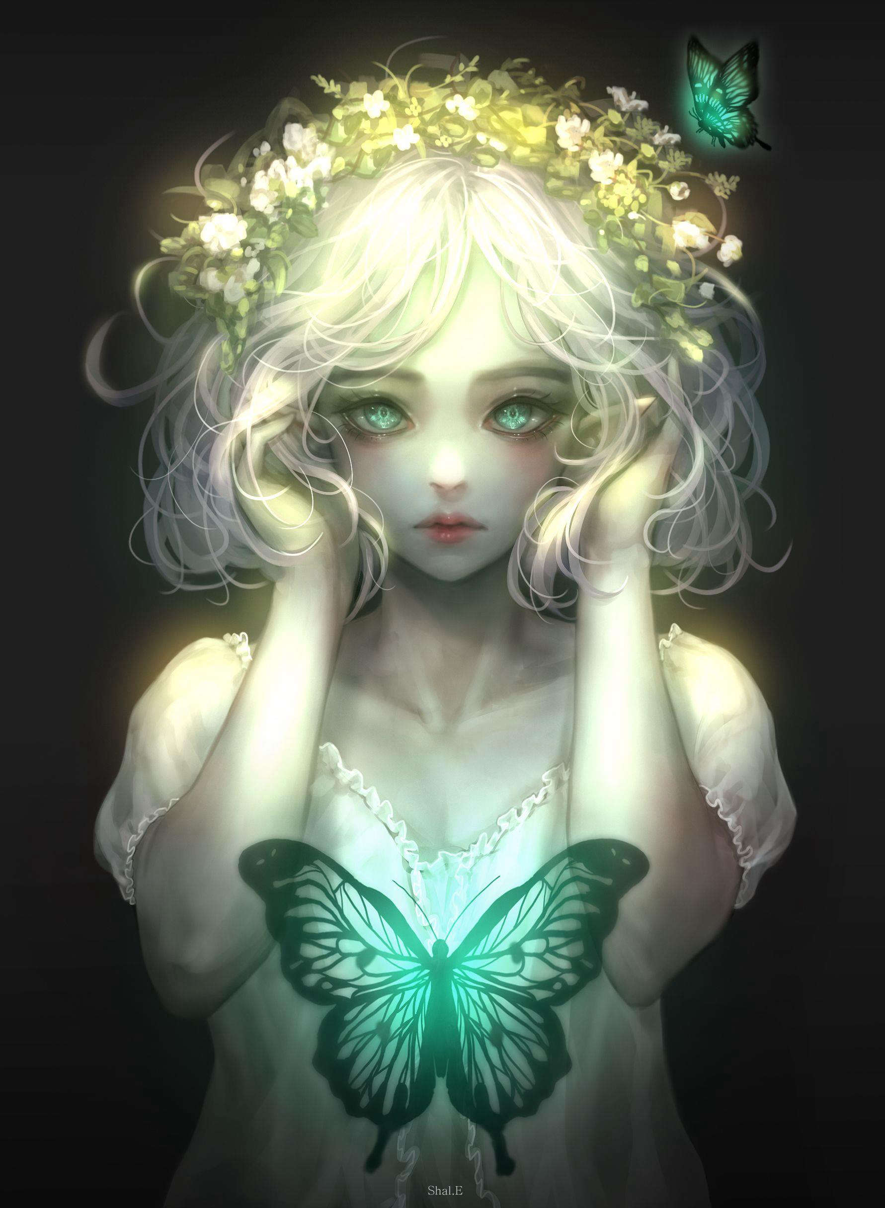 Она была одета в ночную рубашку, а на голове лежал мерцающий венок из волшебных цветов. Над ним порхало несколько изумрудных бабочек.