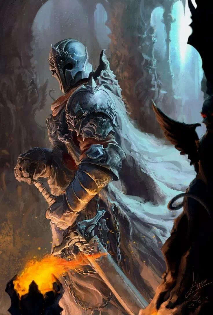 Высоченный, больше двух метров, гигант. У его бедра на цепях висели ножны с тяжелым двуручником, который, на фоне Короля, выглядел простым полуторником. Сам же воин — закованный в глухие доспехи с острыми шипами и хищного вида пластинами в сочленениях. На голове покатый шлем без украшений, но с низким, литым забралом. За спиной стальной воротник, из которого струился белый плащ-шкура.