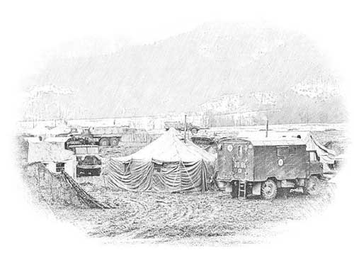 Горы огромным полукольцом. Туманы. Ночные, утренние, вечерние, дневные, круглосуточные. Палатки. Лагерь обнесён МЗП [7] и колючей проволокой. По периметру – часовые. Выход за пределы – событие. Сердце отряда – автоперевязочная. ГАЗ-66 с кунгом, к нему с двух сторон при помощи железного каркаса приставляются небольшие палатки-крылья, а в самом кунге – мини-операционная с необходимым оснащением. Эта АПэшка – средство передвижения, рабочее место, место жительства, да ещё и лазарет для раненых и больных. И жили, и лечили, и ездили, и погибали не менее героически, чем пехота и “мазута”.