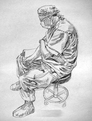 Бешено вращая неестественно белыми глазами на сером, землистом лице, перед Распутиным лежал младший оперуполномоченный Заваров. Осколком мины по касательной снесло теменную кость вместе с мозговыми оболочками. Видны извилины головного мозга… Странно, что в сознании. Своего бывшего “подопечного” не признал, но это и неудивительно. У него шок, а Григорий в маске и с зеркалом отоларинголога, закрывающим пол-лица. У врача времени на эмоции нет, указания выдаются на автомате: