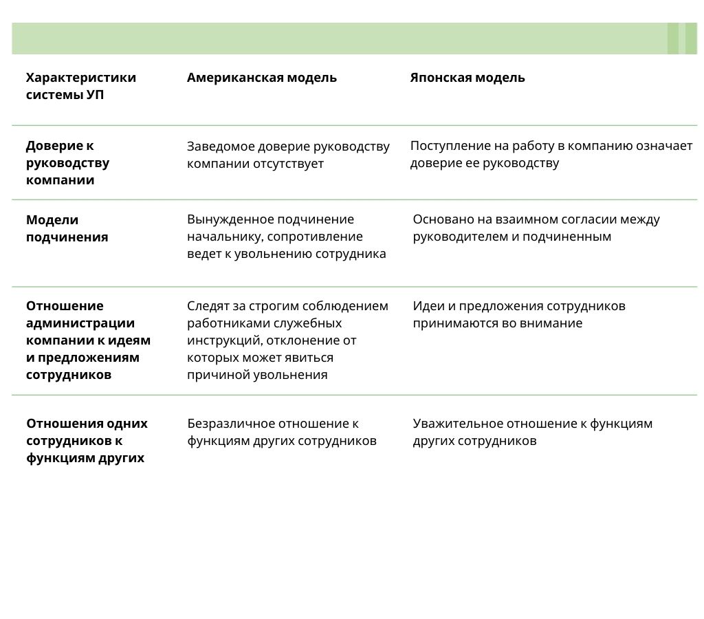 Как видно из таблицы, американская модель управления организацией приспосабливается к внешним обстоятельствам, изменение которых изменяет деятельность организации в целом. В японской модели управления важнейшие механизмы изменений связаны с внутренними механизмами размещения рабочей силы.