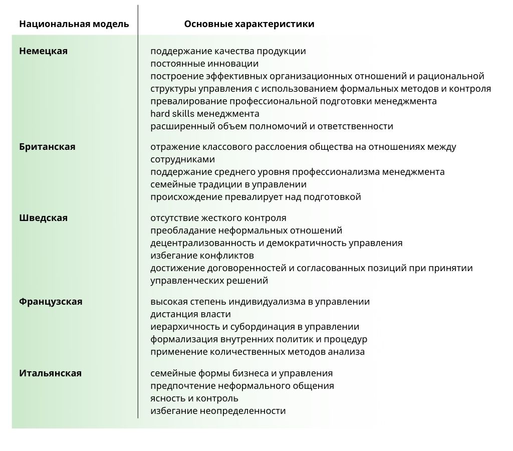 Европейская модель менеджмента существенно отличается от моделей Японии и США, главной чертой которых является достаточно жесткий подход к вопросу управления персоналом. Большинство европейских стран (Норвегия, Англия, Швеция и Голландия) интенсивно развивают принципы менеджмента, позволяющие каждому сотруднику избрать определенную роль в управленческом процессе. Помимо этого, европейская модель менеджмента развивалась в направлении определения человеческого поведения при оказании на него коллективного воздействия.
