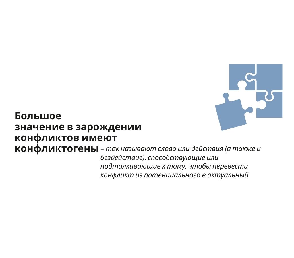 Конфликтоген – это слова, действия, реакции или бездействие, способствующие возникновению конфликтной ситуации и развитию открытого конфликта, то есть переводящие конфликт из потенциального в актуальный.
