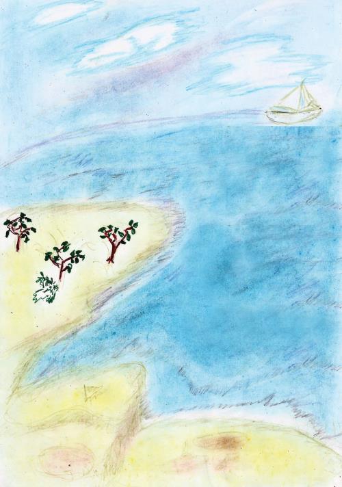 Митьке протянули лист бумаги и карандаши. Он хитро улыбнулся и стал быстро рисовать. С каждым новым штрихом на бумаге оживала картинка: плыли облака, ветер шевелил листву на деревьях, морская волна омывала песчаный берег. А вдалеке виднелся белый парус!