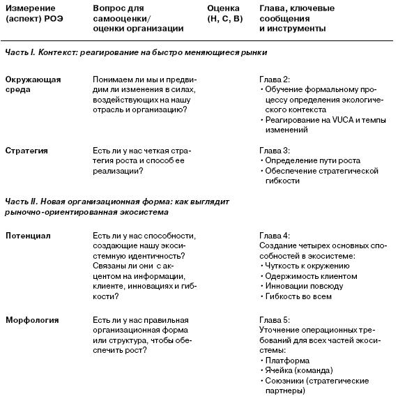 Используйте таблицу для диагностики: оцените, как вы или ваша организация претворяете в жизнь каждый из аспектов рыночной экосистемы. Дайте себе буквенную оценку: Н для низкой, С для средней и В для высокой производительности (либо определите эти буквы по-своему). Вам следует уделить дополнительное внимание тем измерениям (аспектам), которые получат оценку Н.