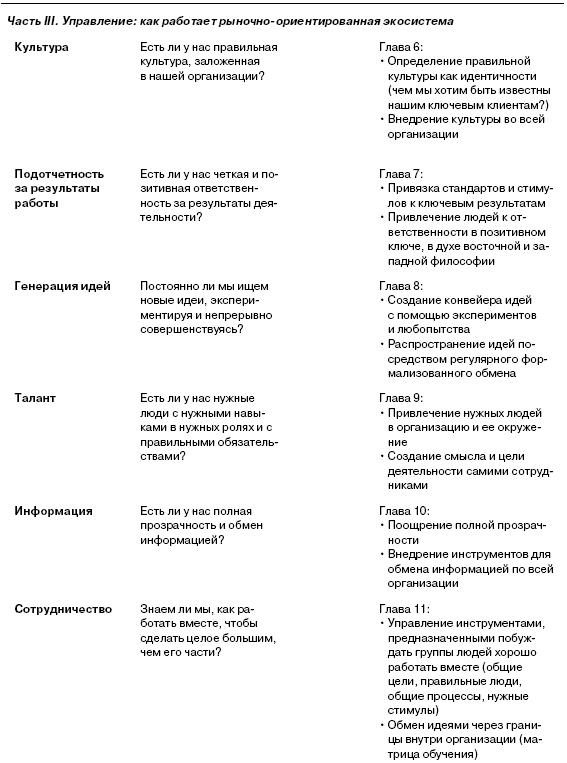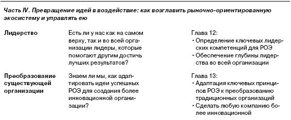 Во-первых, сначала просмотрите все целиком, но начинайте только с части преобразований. Эта книга задумана как всеобъемлющее руководство, чтобы помочь вам увидеть все части и то, как все они работают вместе, в целом. Шесть измерений на рисунке 1.4. предлагают вам целостный системный подход к созданию рыночной экосистемы и представляют общую логику новой организации. Для каждого измерения мы предложим принципы, которые позволят сформулировать ваши собственные предположения о вашей организации. Мы поделимся с вами историями, чтобы проиллюстрировать данные принципы на практике. И предложим как оценки, которые помогут вам определить, где ваша организация находится сегодня по соответствующим измерениям, так и некоторые эффективные инструменты для их повышения.