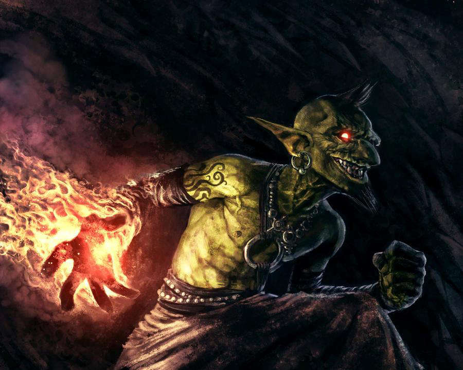 Обе ладони гоблина охватывало сильнейшее пламя, но того это нисколько не беспокоило. Как и тот факт, что его глаза полыхали изнутри адским пеклом. За ним следовало несколько бойцов, стараясь держаться подальше от своего предводителя. Опасливо косились на него и разве что не тряслись.