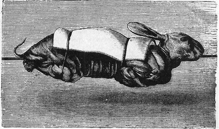 Заяц на вертеле. Иллюстрация из книги П. Симоненко «Образцовая кухня и практическая школа домашнего хозяйства» (1900)