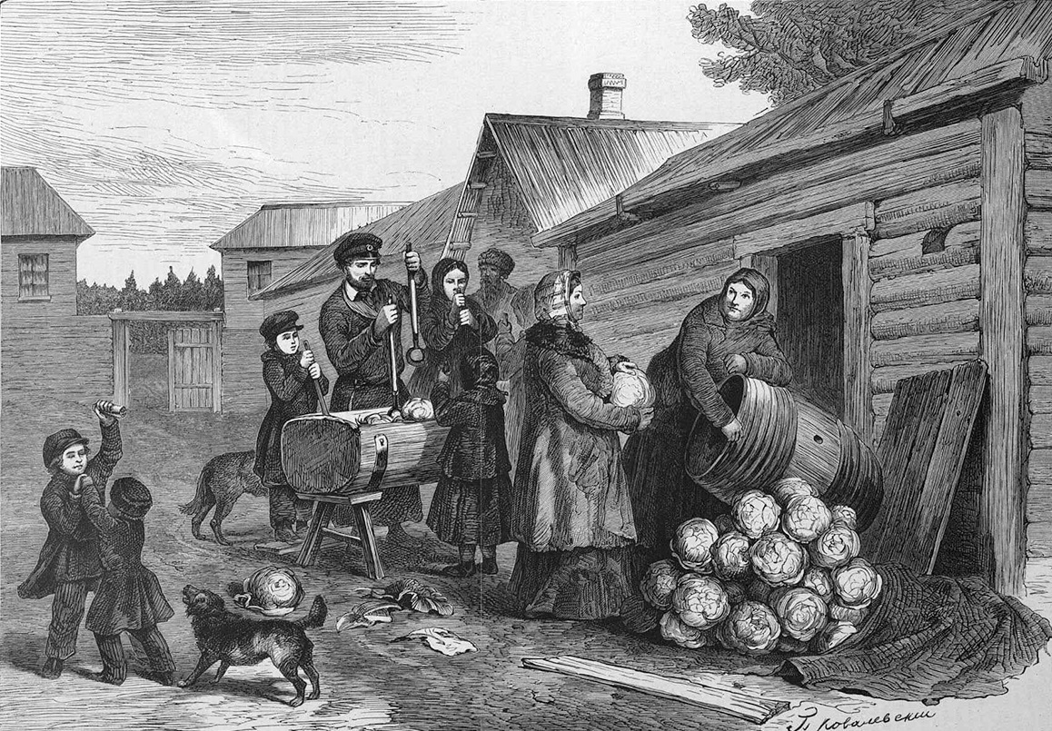 Когда осенние морозы делаются уже очень ощутительными, тогда капустные вилки свертываются круче, увеличиваются, твердеют, и тут является во всех жилищах, от белокаменных палат до убогих хижин, забота заготовлять впрок капусту. Горожане и не имеющие своих огородов покупают эту вещь на базарах, которые в городах и торговых селениях в это время наполнены возам кочней. Но большая часть обитателей нашего края имеют свои капустники. Те же, кто не имеет их или у кого капуста родилась дурно, стараются купить в соседних капустниках 75 .