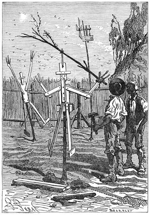 После 20 ноября мост был окончен. Его подвижная часть, уравновешенная противовесами, раздвигалась, и, чтобы привести ее в движение, требовалось лишь небольшое усилие. Между шарниром и последней балкой, на которую опиралась эта половина моста, когда ее опускали, был оставлен просвет в двадцать футов, через который не могли перейти никакие животные.