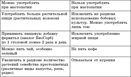 Устранить все факторы, которые приводят к гормональному дисбалансу, помогает, в первую очередь, правильное питание. В рацион необходимо включить вещества, положительно влияющие на функции систем организма, укрепляющие здоровье и снижающие риск многих заболеваний, в том числе и мастопатии. В таблице 1 указано, что можно и что нельзя употреблять при гормональном дисбалансе, в частности при мастопатии.