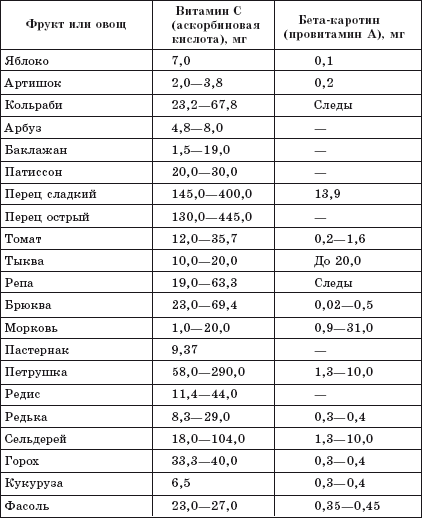 Для увеличения количества антиоксидантов в рационе полезно пить ежедневно 3–4 чашки зеленого чая без сахара, готовить витаминные чаи из шиповника, черной смородины, красной рябины и других ягод и фруктов. Природным источником бета-каротина являются овощи и фрукты (табл. 3).