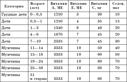 В таблице 6 даны сведения для людей разного пола и разных возрастных групп по рекомендуемым профилактическим дозам приема антиоксидантных витаминов и селена.