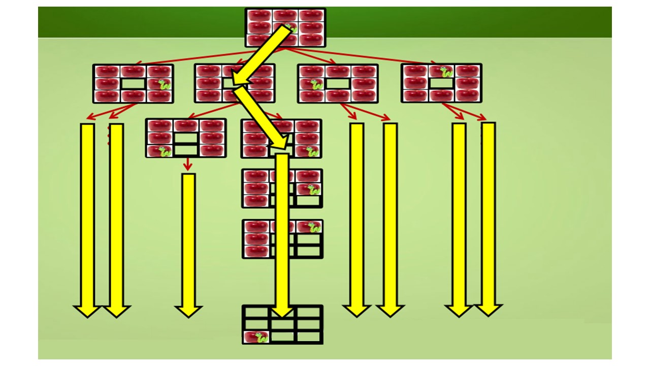 Из задачи 2D квадратных яблок, мы можем наблюдать, что червь сможет съесть все яблоки, если он начинает с ячейки с красным яблоком. Применяя то же правило в задаче квадратных яблок 3D, мы можем быстро сказать, что червь не сможет съесть все яблоки, если он начинает из центра куба, в котором содержится зеленое яблоко. Аналогичным образом можно быстро сказать, что червь может съесть все яблоки, если он начинает с угла куба, который содержит красное яблоко.