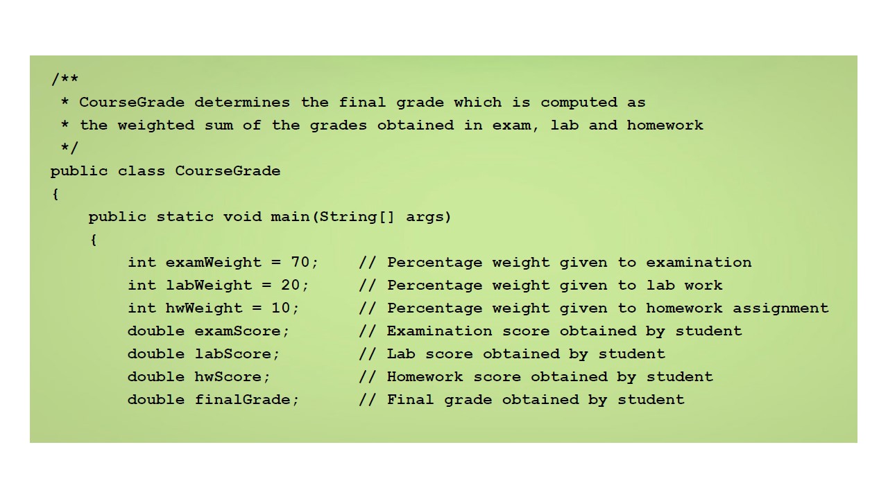 Далее, мы вернемся к примеру CourseGrade и используем то, что мы только что узнали о переменных, объявлениях, типах данных и арифметических выражениях, чтобы получить более глубокое понимание того, как эта программа выполняется.